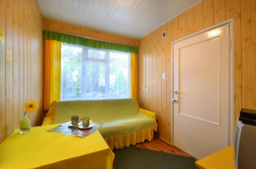 Pokój na parterze z wersalką i jedną leżanką. Oprócz tego, znajduje się w nim stół z krzesłami, szafki przyłóżkowe i szafa ubraniowa. Posiada własną łazienkę, telewizor i lodówkę. Wschodnia ekspozycja okna balkonowego zapewnia naświetlenie pokoju zwłaszcza w godzinach dopołudniowych, a także umożliwia dodatkowe, bezpośrednie i swobodne wyjście z pokoju w celu skorzystania ze stolika i fotelików usytuowanych pod tarasem, chroniącym nas w deszczowe dni. W korytarzu, bezpośrednio przy drzwiach wejściowych do pokoju, do dyspozycji Gości są czajniki, lodówka i kuchenka mikrofalowa. Powierzchnia pokoju wynosi ok. 11,5m2.